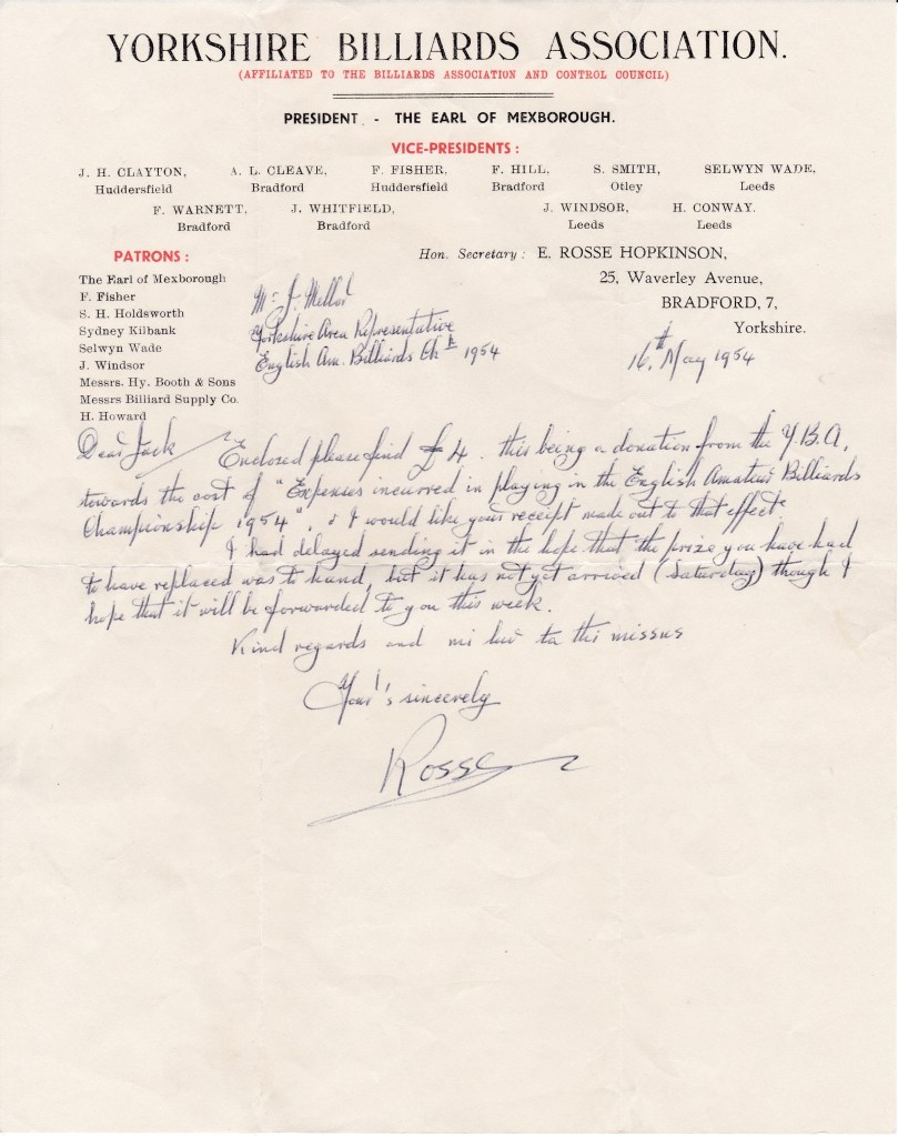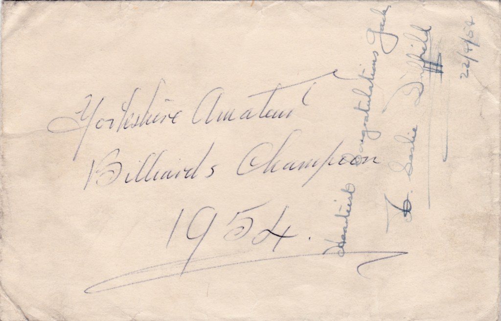 The envelope that must have contained something for winning the Yorkshire Billiards Championship, maybe cash or a cheque but I don’t think Jack would have a bank account back in those days. The other writing says “Heartiest Congratulations Jack” signed A Leslie Driffield and dated. Leslie was at the time the English Amateur Billiards Champion, and presumably watched the match; two champions together. Along with qualifying for the English Championships proper, this win was probably Jack’s finest achievement.