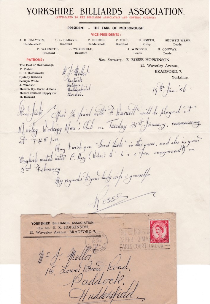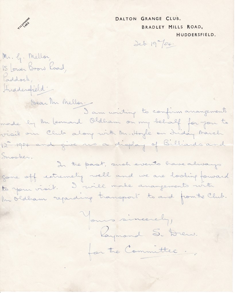 It wasn’t only professionals who gave exhibitions, as this letter from Dalton Grange shows. Jack and his Huddersfield team mate Gladney Hoyle were to give a display of both Billiards and Snooker. It would also appear as if they will be taken to the club and taken home after, treated like royalty. I wonder if they got a small remuneration for their nights work or at least some beer money. It’s a pity they couldn’t get his name right, “G“.