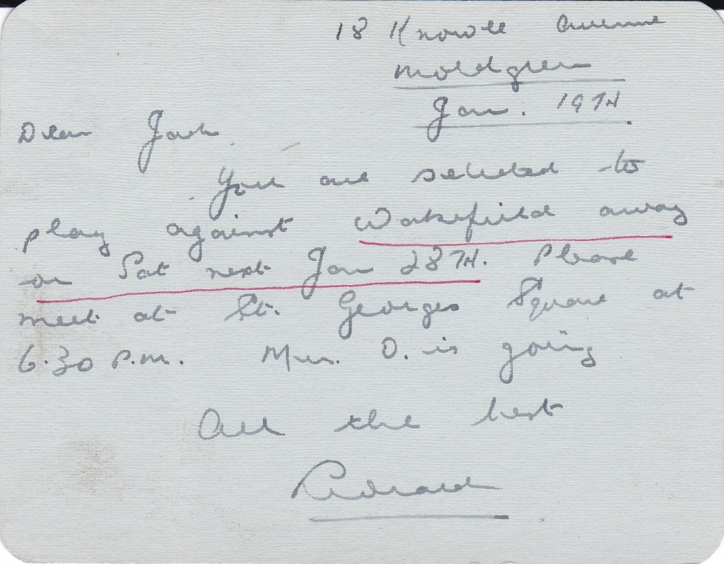 Another postcard from Leonard Oldham, letting Jack know he was selected to play for Huddersfield in the Yorkshire League game away at Wakefield. The last bit “Min O is going” I think might refer to Leonard’s wife who’s name might be Minnie which, in itself is a diminutive of Winifred – but I’m guessing.