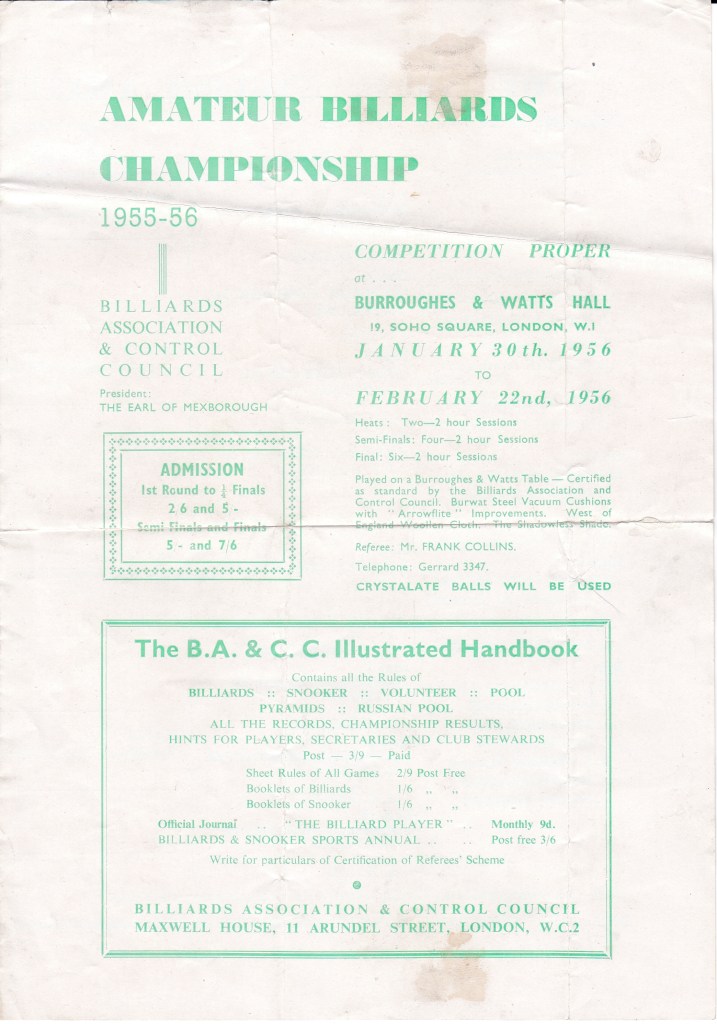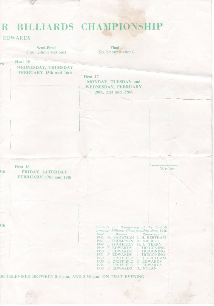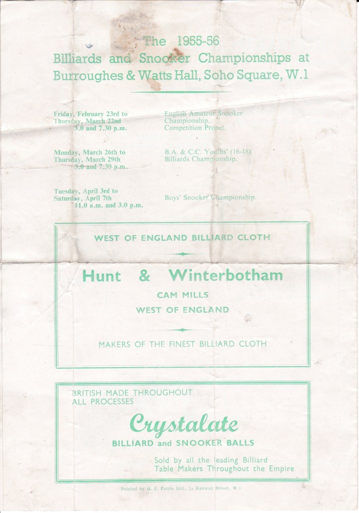 As well as the Billiards final, we can see from the back of the programme that the Snooker finals will be played in February. Huddersfield had several players in these days that won through to represent Yorkshire at snooker.