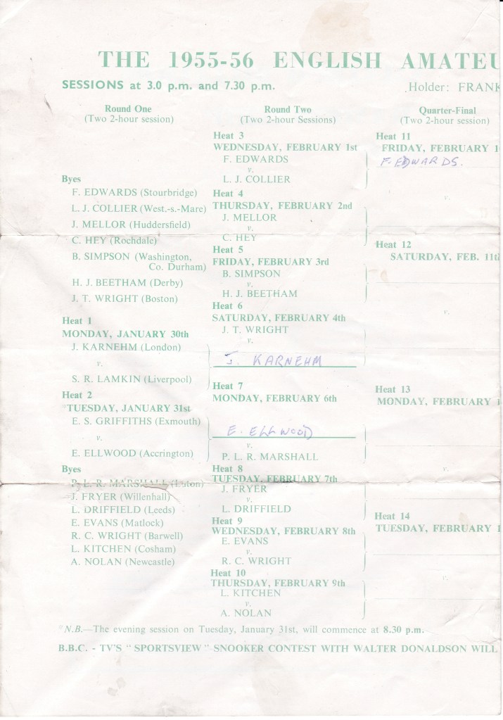 As we can see, Frank Edwards and Leslie Driffield have dominated the competition for the past seven years. As they were in the finals that year I would think that there was a strong possibility that, as they were in opposite sides of the draw, they could have met in the final.
