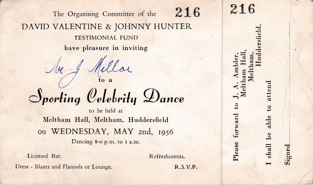 I don’t know if this was a free ticket given to Jack as a sporting notary, but as the stub is still attached it begs the question of whether or not he attended. Dave Valentine and Johnny Hunter were Fartown Rugby players who had played from 1947 and retired the following year after ten years’ service. They were members of the team in 1948/49 when they won the League Championship, and in 1953 when they won the Challenge Cup.