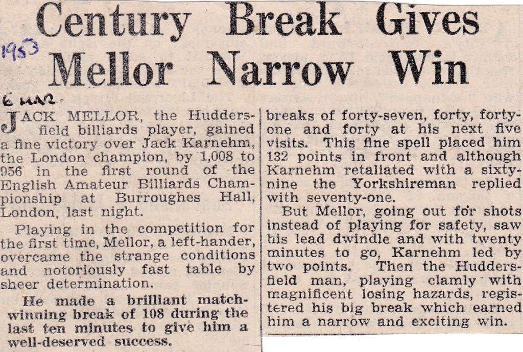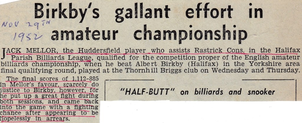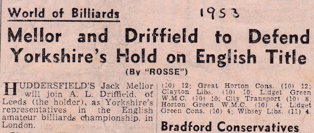 Confirmation that Jack will be the Yorkshire representative in the England Amateur Billiards Championship proper to be held at Burroughes Hall, 19 Soho Square, London in February next year, 1953. He will be joined by another Yorkshire man, Leslie Driffield, as holder of the trophy which he won earlier this year.