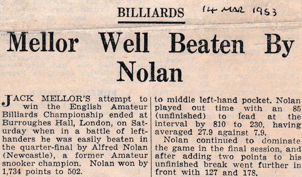Jack won fairly easily by 1112 – 885, which included two century breaks of 100 and 113. Albert had lost at the same stage of the previous year to Leslie Driffield 1313 – 944. Albert and Jack would lock horns many times in the coming years, with Jack coming out on top most times.