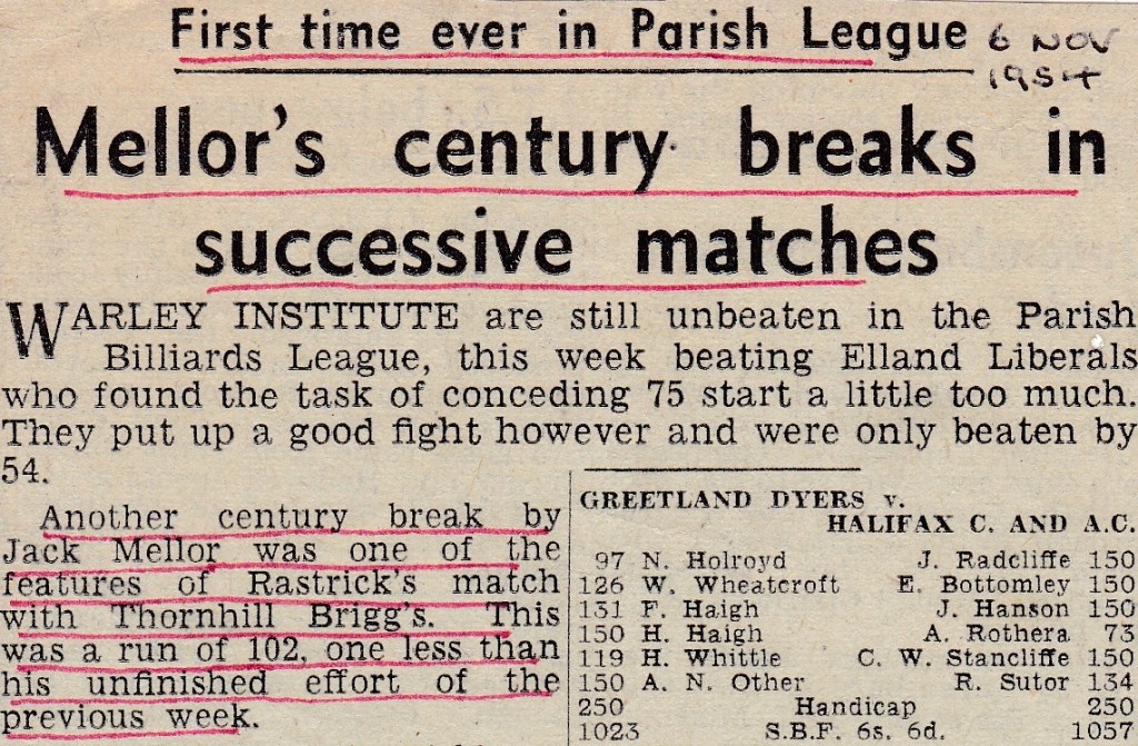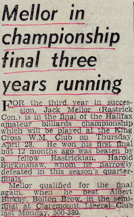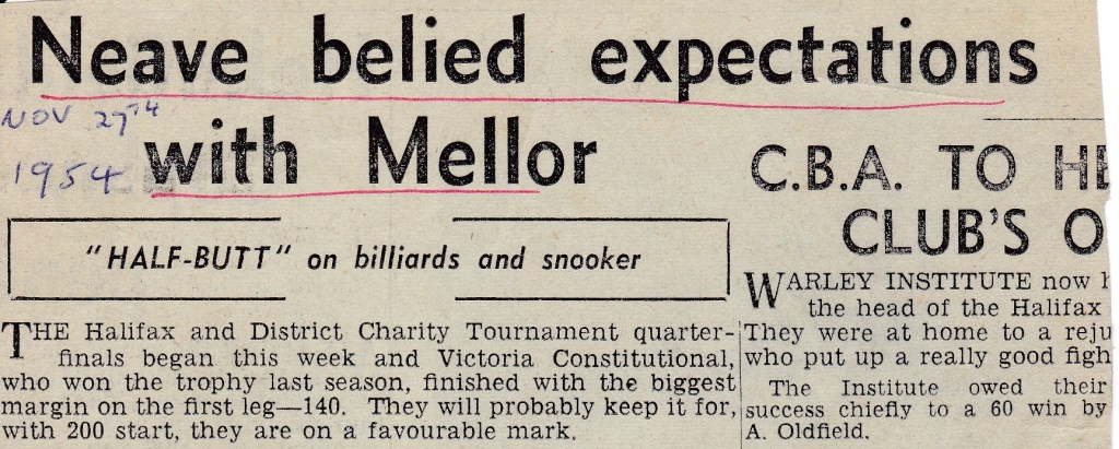 Half Butt thought that Arthur Neave, who played for Ripponden Conservative Club in another league, would “fully extend” Jack in their Charity Tournament – but it didn’t happened as Jack won 150 – 58. The other headline again is all about Jack losing and it refers to him as being the Rastrick “Star”. I suppose, because he won so many games, it is a “headline” when he loses, though they do seem to love it when it happens.