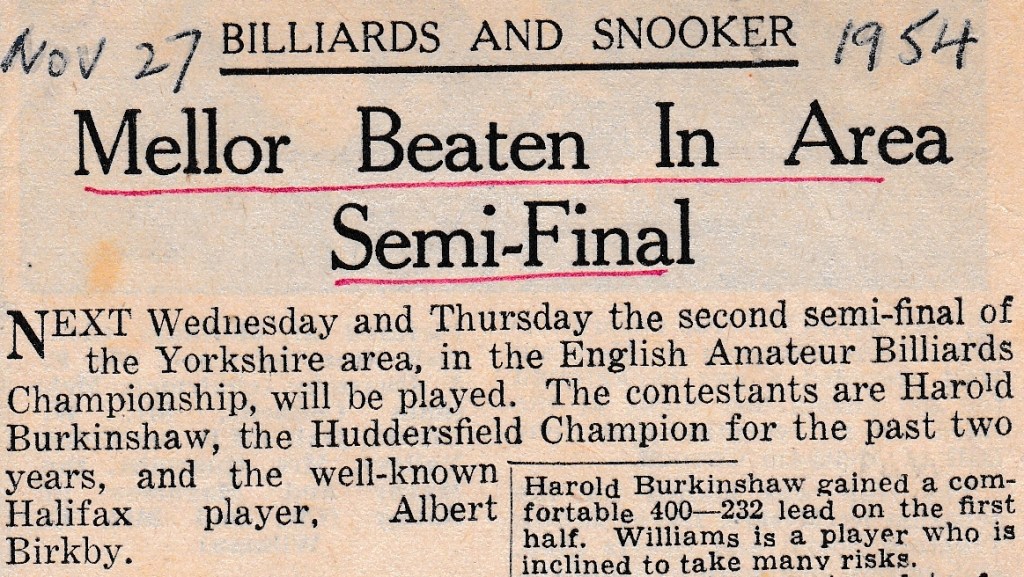 The Huddersfield Examiner headline is a bit understated, whereas the Halifax Courier wants to emphasise that the “STAR” had been beaten; as it had done on other occasions. They also need to mention that their main man, Albert Birkby, is still in the competition. Albert did make it to the competition proper in London, but unfortunately drew the holder, Leslie Driffield, in the first round and lost 1656 – 699. In the semi-final, Jack was behind by over 200 with twenty minutes left and, despite a magnificent break of 111 followed by one of 57, he was still 60 adrift when time was called.