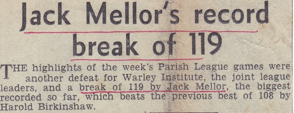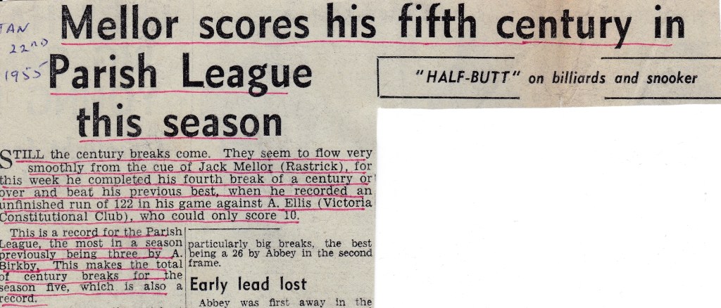 Despite Jack losing in the Charity Tournament, he continued to rack up the centuries and records in the Parish League. He would have been pleased that he beat his team mate Harold for the top break of the season with his 119. He would have been even more pleased to have beaten Albert Birkby’s previous record of three century breaks in a season with his fourth of break of 122 – though I bet the local billiard players aren’t.