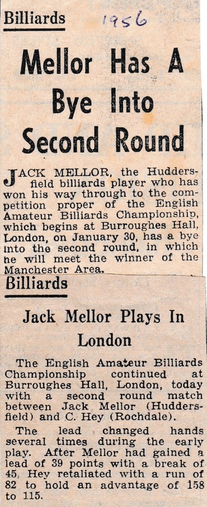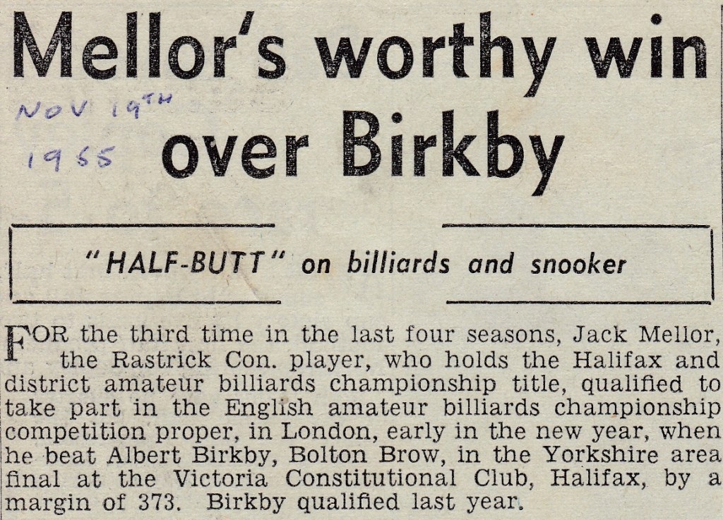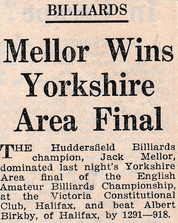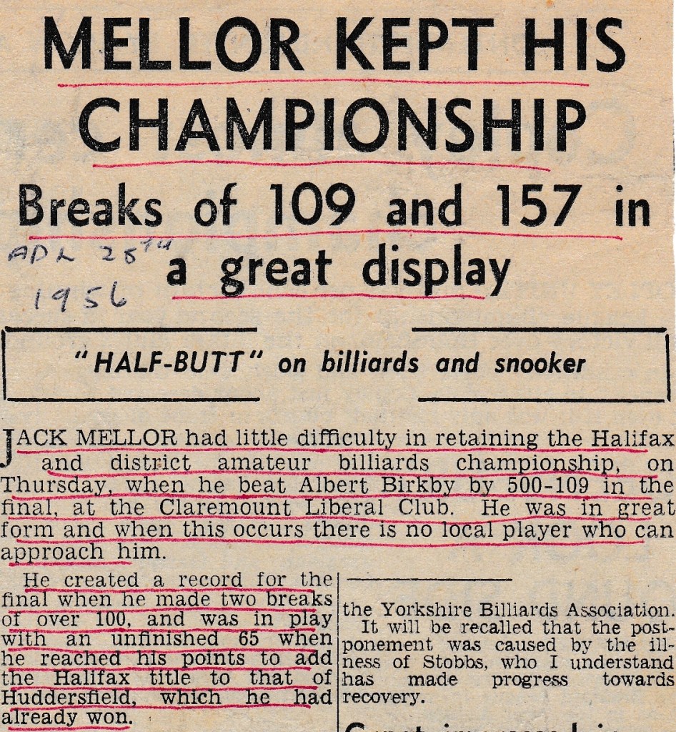 Jack started the defence of his Halifax Billiards Championship with a good victory in the first round. Harold Burkinshaw had to withdraw due to ill health in the round of 16 which meant that Trevor Bottomley went into the quarter-final. He beat his quarter final opponent and went on to meet Jack in the semi-final. Albert Birkby was awaiting the winner of that semi-final and must have hoped that Bottomley could beat Jack. Unfortunately it wasn’t to be and, as we see from the headline across, Jack beat him with some ease creating another record and winning his third Championship in four years.